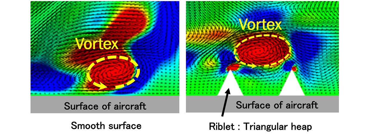 Rotating flows called vortices near the surface of the aircraft increase skin friction (left figure). Skin friction is reduced because the riblets (right figure) move the vortex away from the aircraft surface wall.